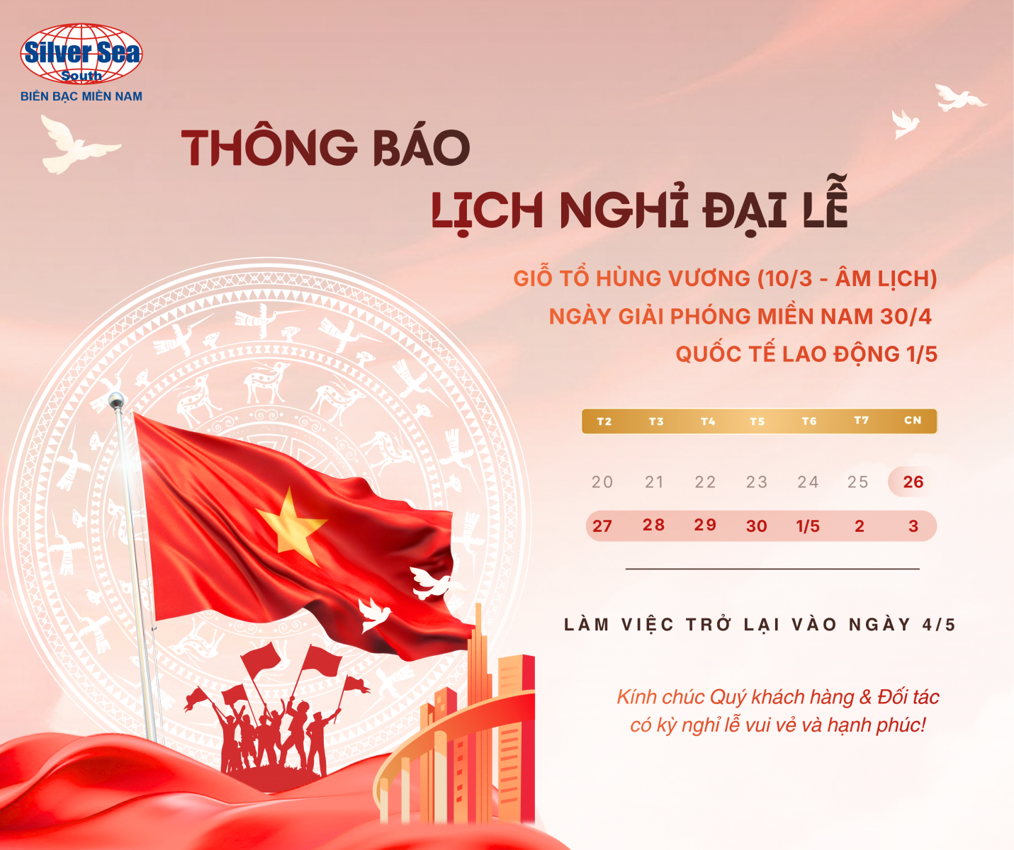 THÔNG BÁO LỊCH NGHỈ LỄ GIỖ TỔ HÙNG VƯƠNG & 30/4 - 1/5